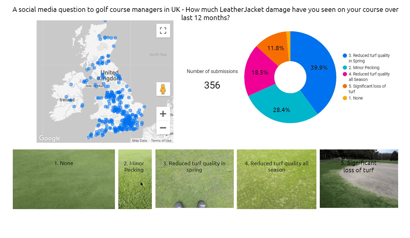 To contribute to this survey by adding the level of damage you’ve seen on your site click here…………. It’s become apparent recently that some Golf Clubs aren’t recognising how widespread a challenge managing greens under LeatherJacket pressure is. A quick social media survey revealed the below. Click here for latest version of report………….