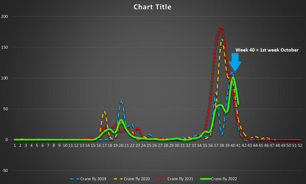 First things first, this is not me saying “Get out there and spray” as we’ve discussed before we want to target applications 1 month post the peak flight to optimise control. For most, peak flight was the first week of October (average across UK) so looking to spray first week of November, but as we know there is a bit of a North/South divide when it comes to Cranefly flights.