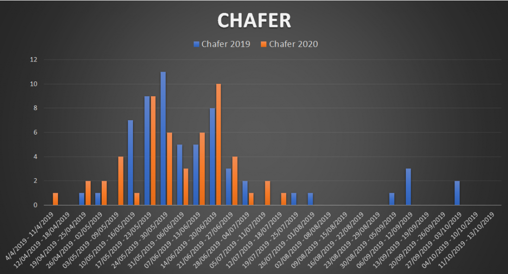 About a month ago I wrote a blog about acelepryn timing for chafers and advised waiting – but NOW is the time to apply. At the time I showed how last year we had pretty much seen the end of the chafer hatch by the end of June.