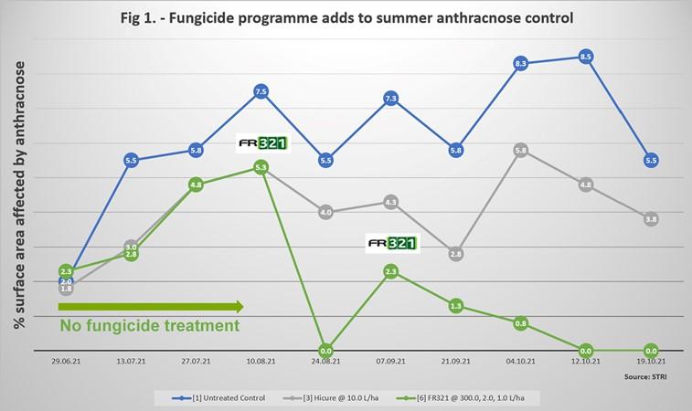 You can see in the below the results of an anthracnose trial at the STRI 2021, where the biostimulant Hicure has done some work to relieve turf stress, this might be an option in low pressure years.