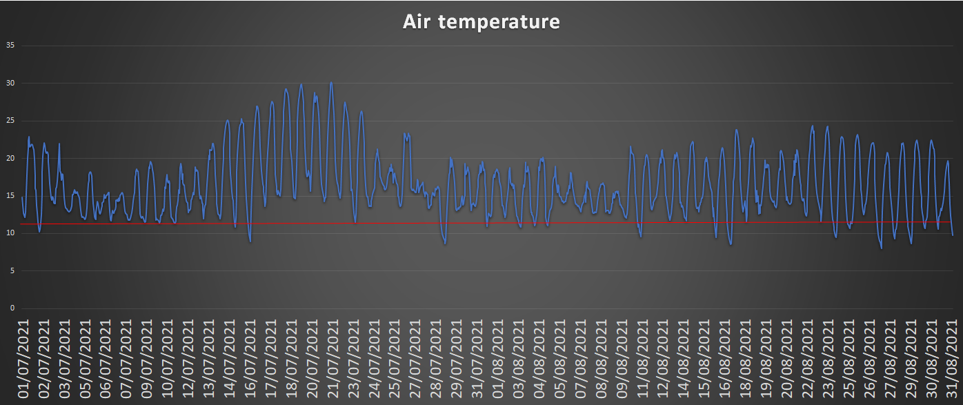 I suspect we are sneaking into brown patch territory with this weather and looking back at the hourly temperatures (below) you can see that we’ve had prolonged periods this year of really stable temperatures – by that I mean no big fluctuations. Overnight temperatures haven’t dropped below 11c on a regular basis until the last week of August. We also haven’t seen high temperatures – this stable temperature is perfect for pathogens to develop.