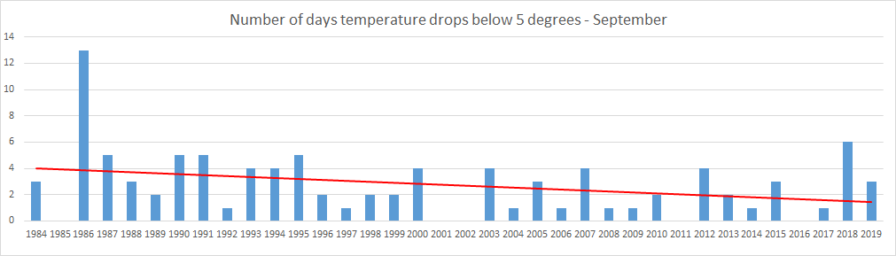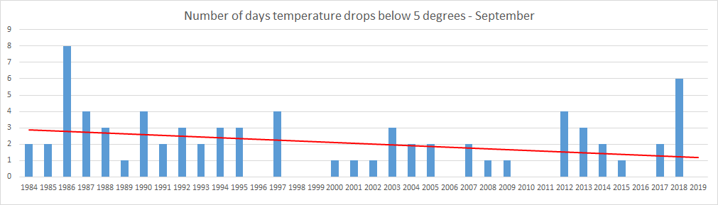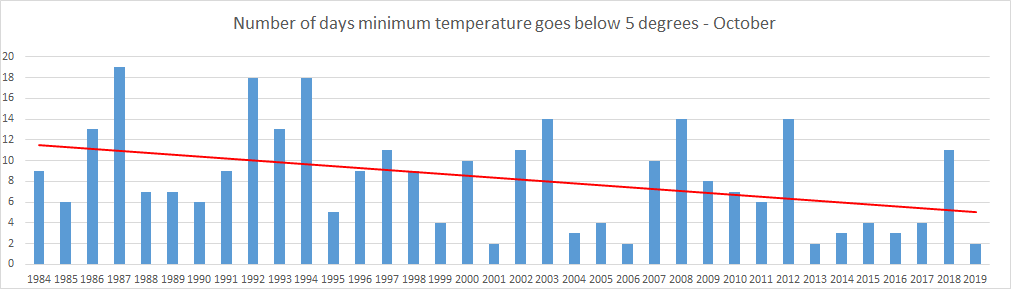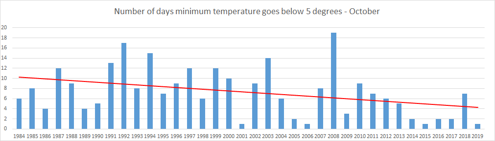 The above graphs show the average minimum temperature during the months of September and October. Once again a clear and worrying trend showing how overnight temperatures are not dipping to the temperatures they once did.
