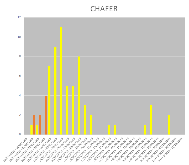 The above video shows this years sightings to date of all Chafers. Thanks for registering them. We’re seeing them a few weeks earlier than last year, now we watch to see when peak numbers begin to fly.