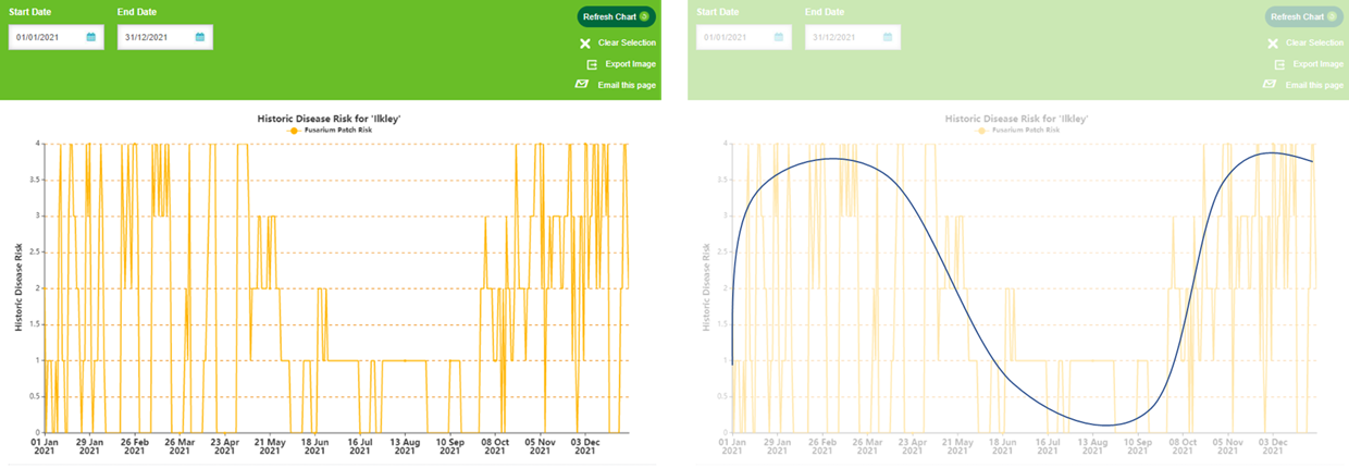 One of its major advantages is to be able to look back and ask what happened when a certain set of weather conditions or weather patterns occurred, and how did that affect your turf? All those seasons of accumulated data are available in the Syngenta Turf historic disease model.