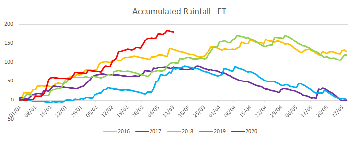 The above graph shows the last 5 years of dry down (rainfall minus Evapotranspiration accumulated from the 1st January.) It’s quite clear when you look at this that 2020 has been a difficult year. but you can also see that we’re only a few weeks away from the point that ET really starts to ramp up. Mid March to Early April is pretty consistently the period things start changing. That’s only 2 – 3 weeks away – just hang on a few more weeks!