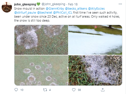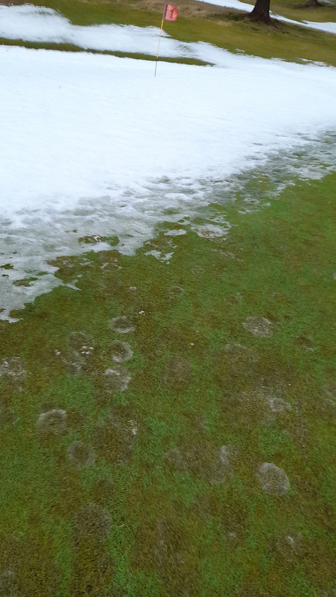 The extended snow cover has caused some problems – John at Dufftown GC has shared these images with me on Twitter, worth saying that none of our products were used in this programme. The cold temperatures going into the snow covered period were not enough to hold Microdochium at bay.