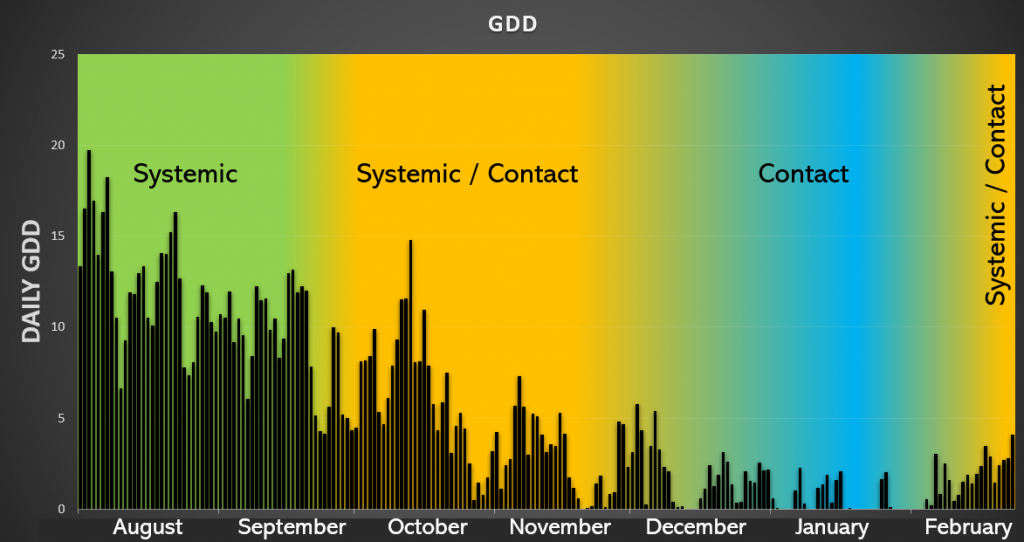 The concept is pretty simple, if turf is growing strongly then use a systemic.