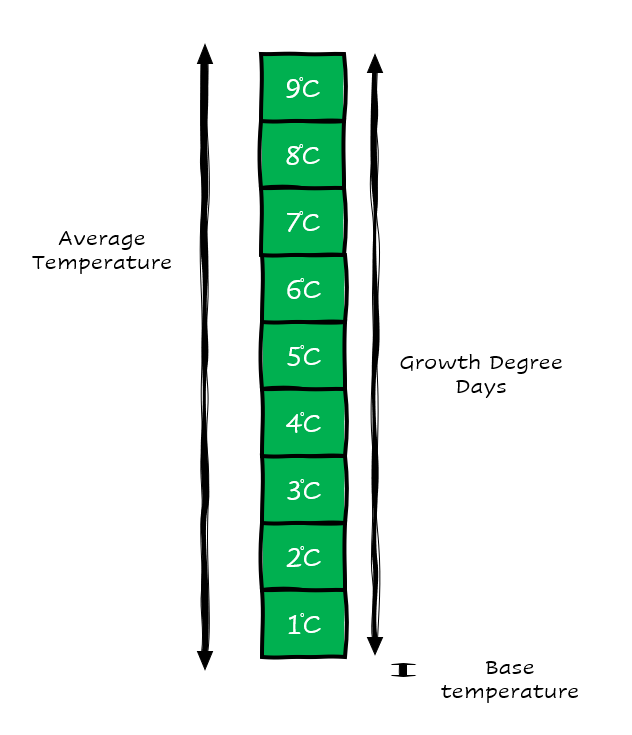 The base temperature is the point where a GDD model stops counting. The below model shows what the equation looks like if the average temperature for the day was 9c with a base temperature of 6c.