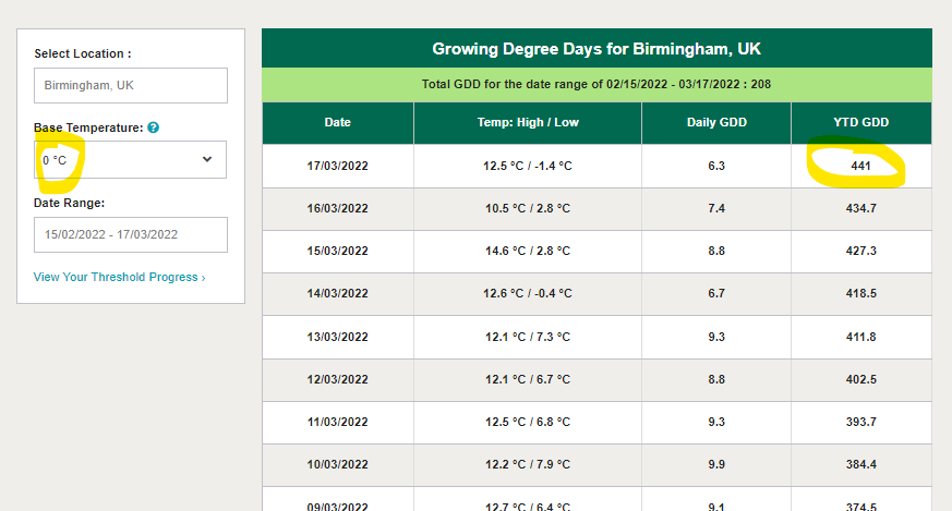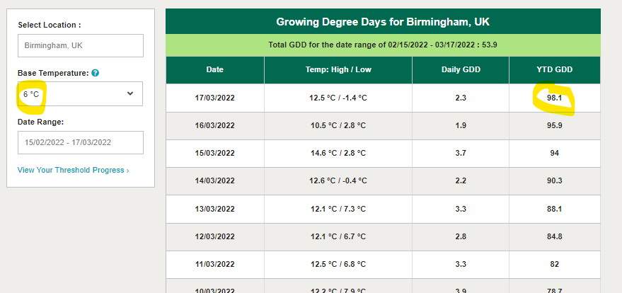 If you’ve been studying the Greencast GDD calculator you’ll see this is the time of year when there is huge differences between 0c and 6c base temperatures.
