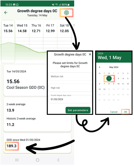 Once you’ve added that module you can select the date of your last PGR spray and it will instantly display the GDD total from then to now, as below: