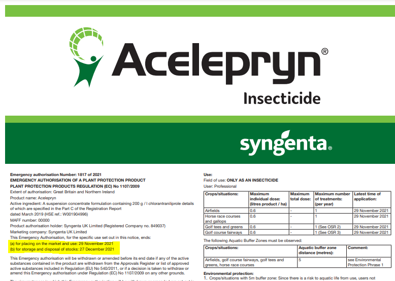 Ok lets start at the beginning, any Acelepryn purchased under the Emergency Authorisation for Cranefly in 2021 must be used by the 29th November 2021 and any remaining stock can only be held until 27th December 2021 before it must be disposed of in the correct manner. Label / EA link here…..