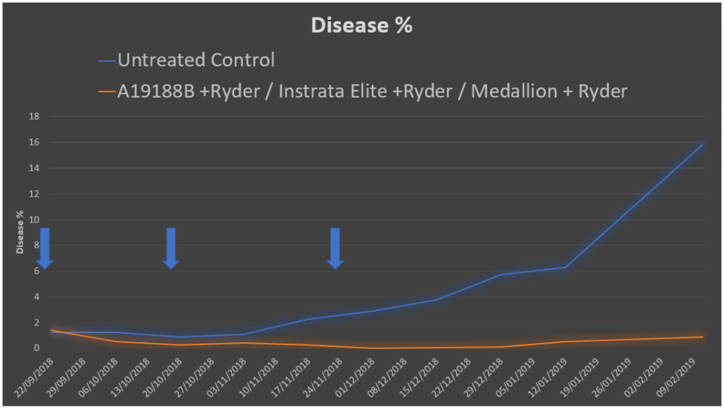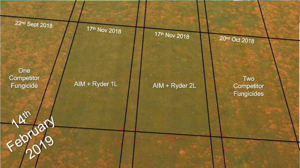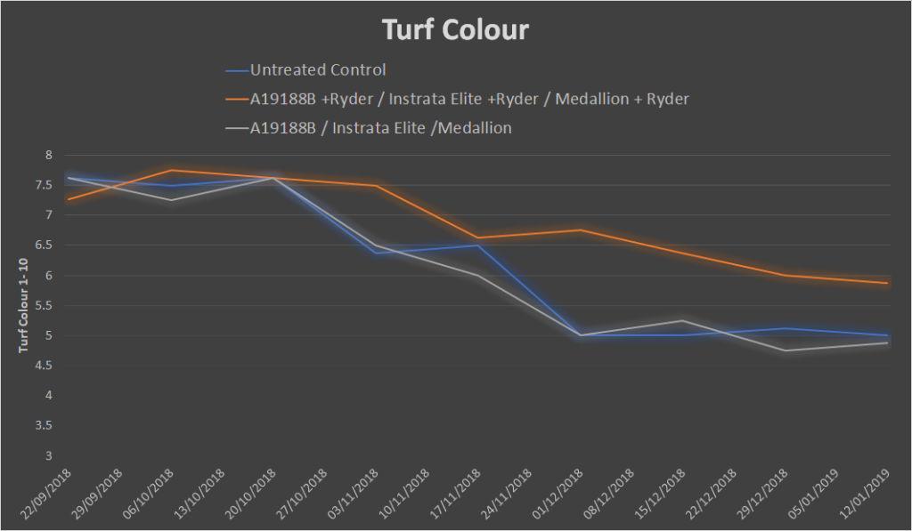 On the back of this leaflet you’ll see some data from a trial we did at the Irish Sports Turf Institute in 2018. In this trial we did some work using Ryder in a tank-mix with A19188b (a product we have in the registration process), Instrata Elite and Medallion.