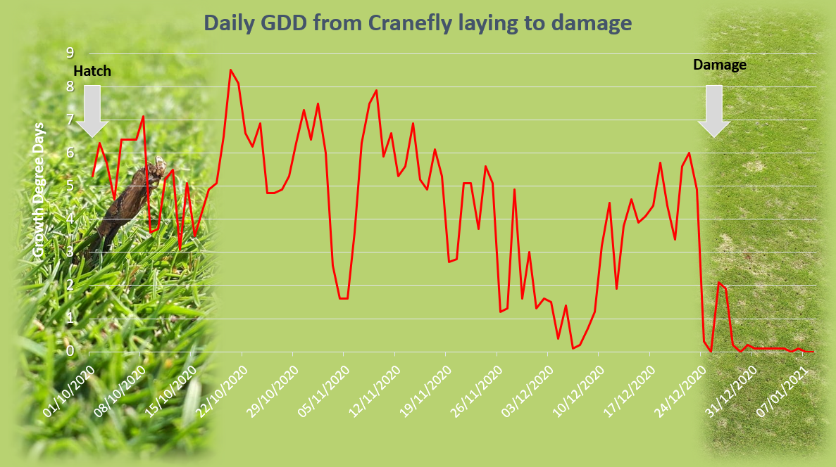 The above chart shows how we’ve had some pretty good growth since the hatch until the Christmas period when the first reports of damage started coming in. Check your growth out on the greencast GDD calculator….