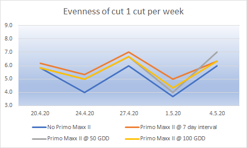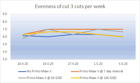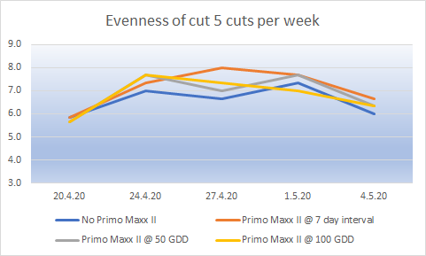 Evenness of cut will have an impact on the quality of the putting surface. The data so far is pointing towards the more cutting – the better the evenness. What surprises me looking at this is how quickly the advantage was lost.