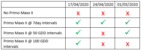The below table shows how the applications are now working out. 7 day windows are currently being applied at least twice as often as the 50 GDD window with the next 100 GDD application not due for what seems like months!