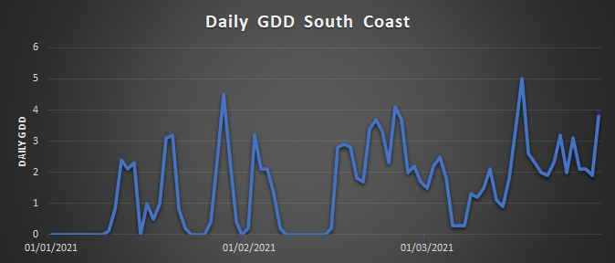 The levels of presentation being displayed is just fantastic and it’s a credit to you all and I’m sure all your memberships will be very appreciative of your efforts. The thing I find interesting is that the levels of presentation (judging by the photos) are far in advance of what I’d expect to see at the end of March. The below graph shows the GDD (BT 6c) to date this year on the South Coast and we haven’t yet hit a day where we’ve reached 6GDD which is always the point I feel things have potential to happen. You can pull this data off our GDD calculator for your site (just copy and paste in to a spreadsheet if you need to create something like this).