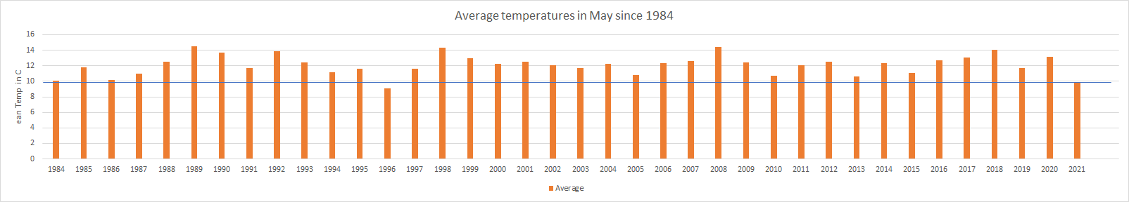 Below is the Average temperature for May for my home address since 1984. As you can see the average temp for May should be around 12C but we are sitting (using a forecast to fill the month in) at 9.8C.