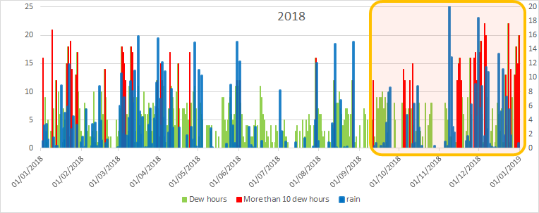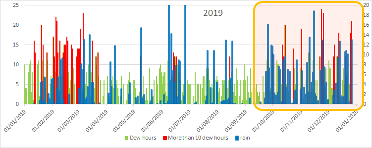 2019 is dominated by the Blue lines which represents rainfall – compared to a very red line dominant 2018. The red lines represent the days when Dew would have been in place for more than 10 hours (this is worked out by using dew points – check this blog out for more info).