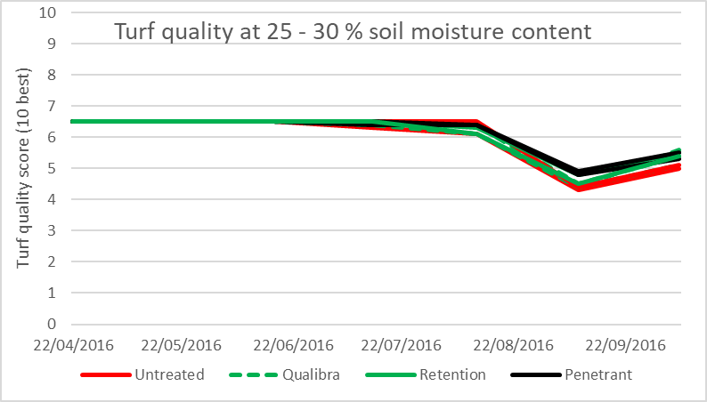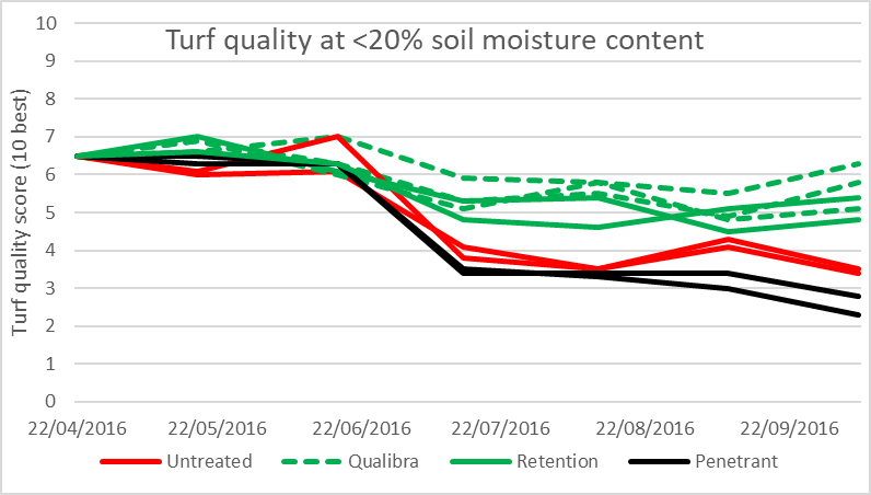 When running surfaces dry – retentive wetting agents will help maintain higher turf quality than untreated. Penetrant wetting agents showed a negative turf quality trend although it was not statistically different to the untreated.