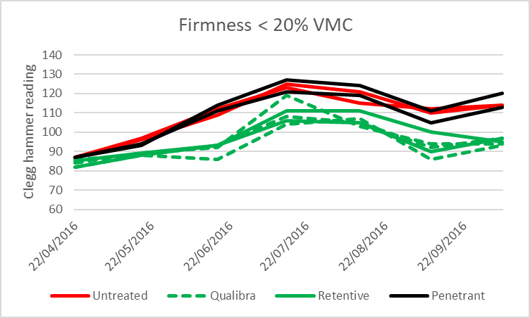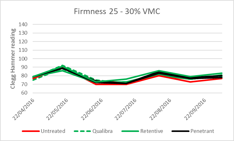 In this part of the trial we wanted to understand the impact of wetting agents on firmness, this was measured with a clegg hammer.