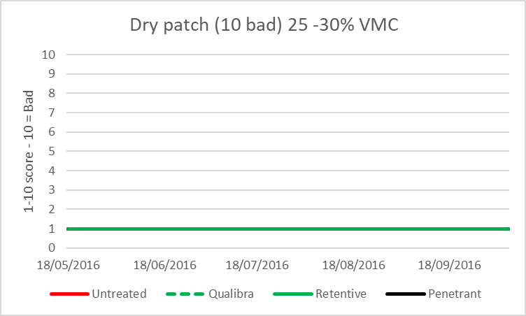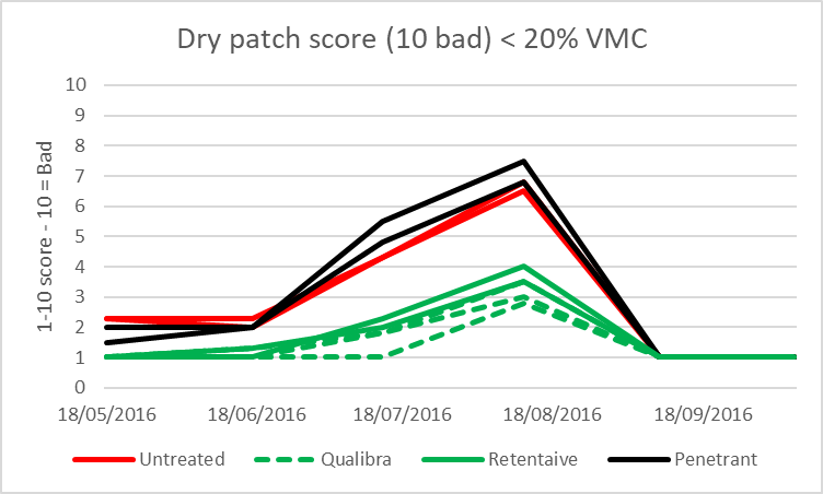 In this assessment we want to establish if dry patch was influenced by wetting agents. This was scored on a 1-10 score with 10 being the highest score possible and 1 showing no evidence of dry patch.