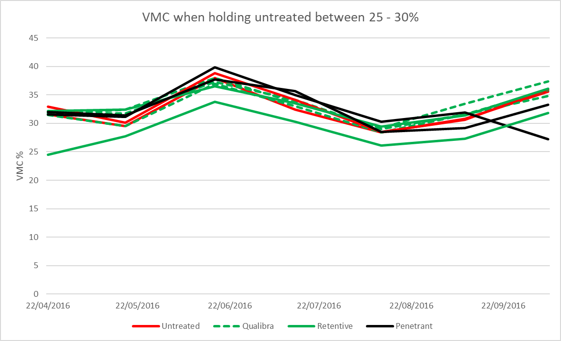 We effectively ran two trials – one where we tried to hold the untreated at under 20% VMC (Volumetric Moisture content – how wet something is) and one where we tried to hold the VMC between 25% and 30%.