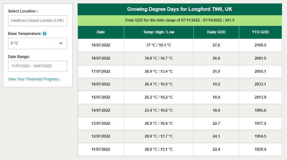 An upper ‘off switch’ temperature is not something we considered necessary even just a few years ago when we started using the GDD calculator in the UK, as it would have so rarely been relevant. But we may look to add this if we continue to see temperatures touching 40C in the future!