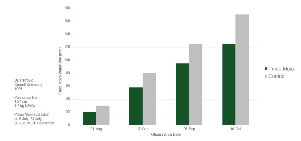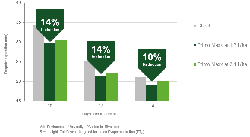 Primo has the potential to lower water use by reduction of cell elongation which in turn will produce a short compact turf with a reduced evapotranspiration (ET) rate and increased chlorophyll content. Primo has been proven to reduced ET rates in both warm and cool season turfgrasses.