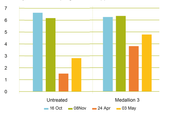 We do several snow trials in Norway where we are faced with the annual challenge of recovering turf quality in the spring. The above trial was two applications of Medallion on the 16th October and 8th November and is a turf quality score. You can see the higher quality coming out of the snow cover leading to a faster spring recovery.