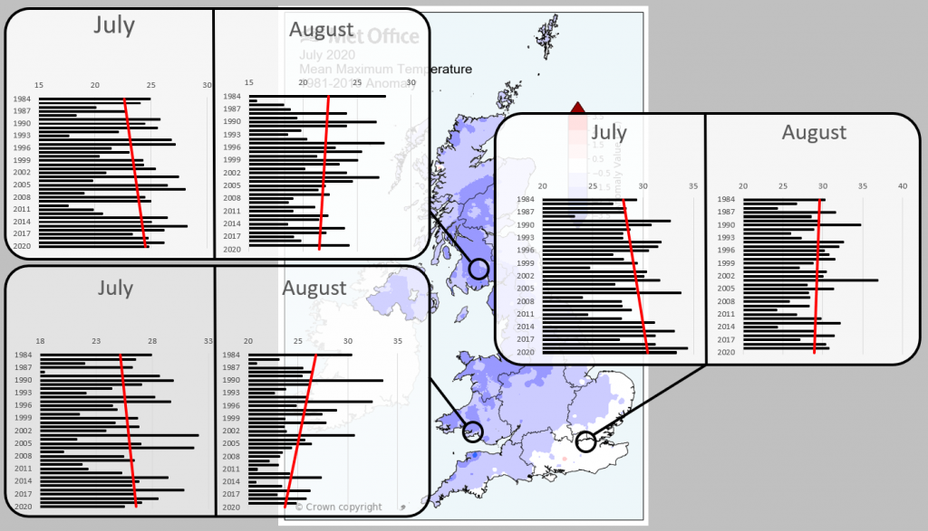 In a blog I referred to this tweet that showed that July had not (at the time of writing) given us a particularly hot day but there was still a worrying trend. As it turns out before we’d finished the month and posted the blog the weather had delivered a 37.8 degree day and continued to add to that worrying trend.