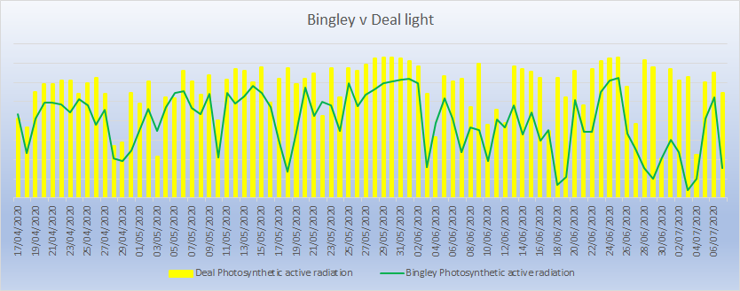 We certainly see more light the further South we go but and this year Deal has seen 29% more light than Bingley has. Light stress should not be underestimated check these blogs out for more…... Whilst immediate impacts won’t be obvious, all of these tools are an investment into the plant to help it get through the tough times.