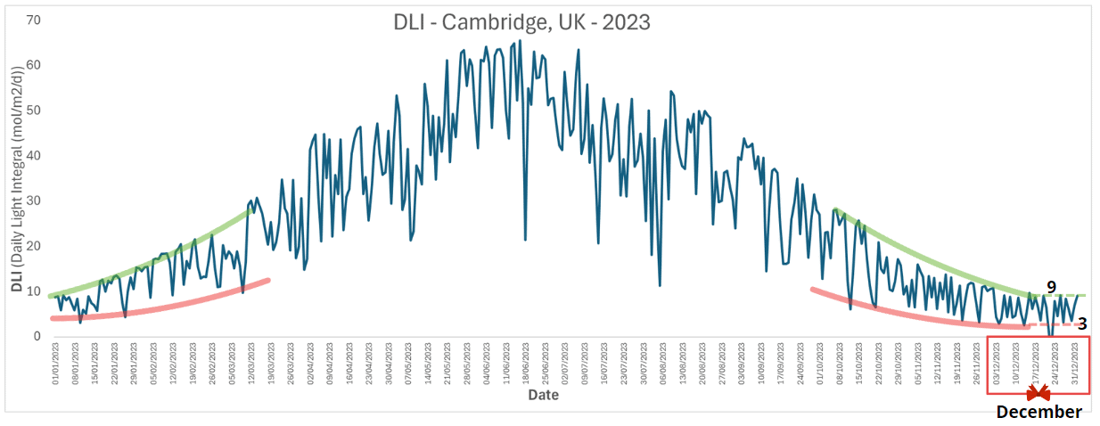 When we look specifically at the end of December we can see the dashed green and red lines trend, the maximum DLI is around 9, and the trend in the minimum is about 3 (for Cambridge 2023).