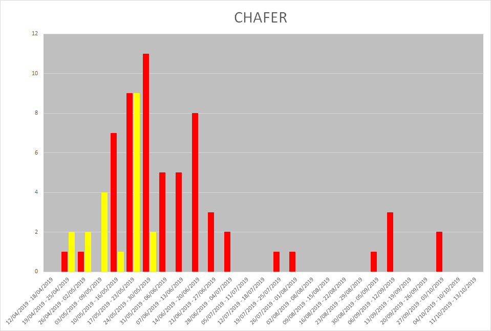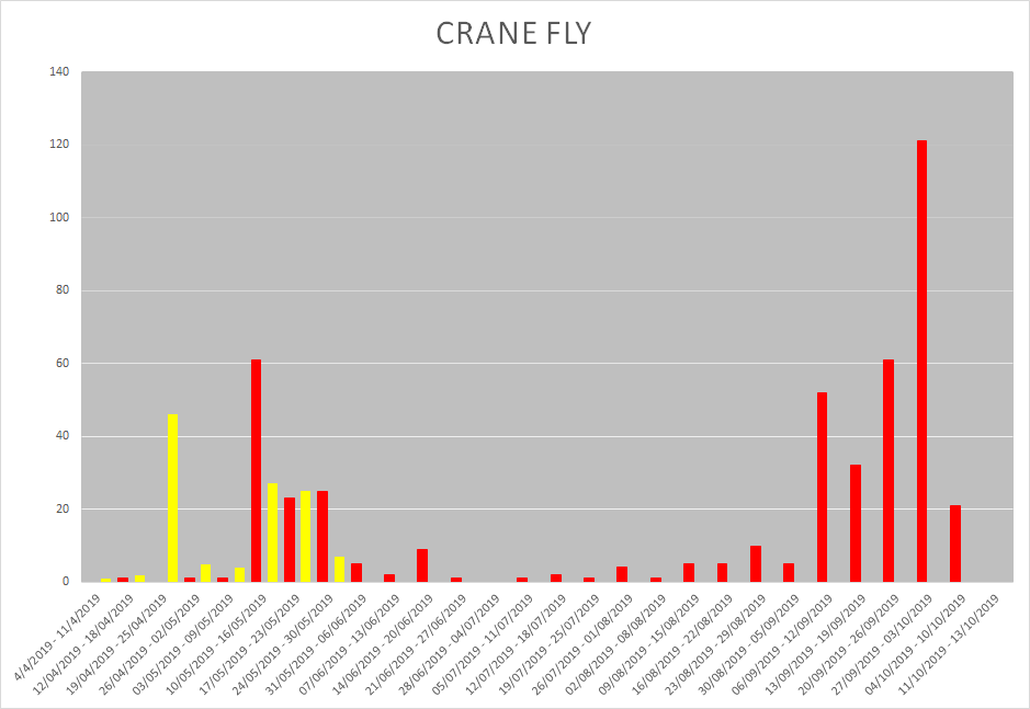 Whilst we don’t yet have an Authorisation for Crane Fly it’s worth monitoring the flight pattern. Again 2019 is in red and 2020 is in yellow. looks like we had an earlier flight spike than last year but not hugely different. A lot of people are reporting back that they haven’t seen hatching Crane fly yet LeatherJacket activity is slowing, if that is the case it’s highly likely they are going deeper for the summer ready to hatch in the Autumn.