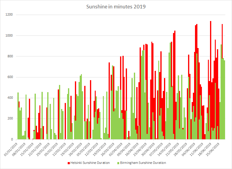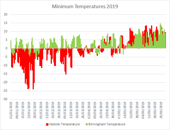 The above two charts show a comparison of the UK midlands and Helsinki. You can see quite early in the year (end of March in 2019) that the light levels in Helsinki regularly exceed ours but the temperatures in Finland stay very low compared to the UK until well into the Spring. In 2019 they didn’t see regular temps above 0C until 2nd week of May.