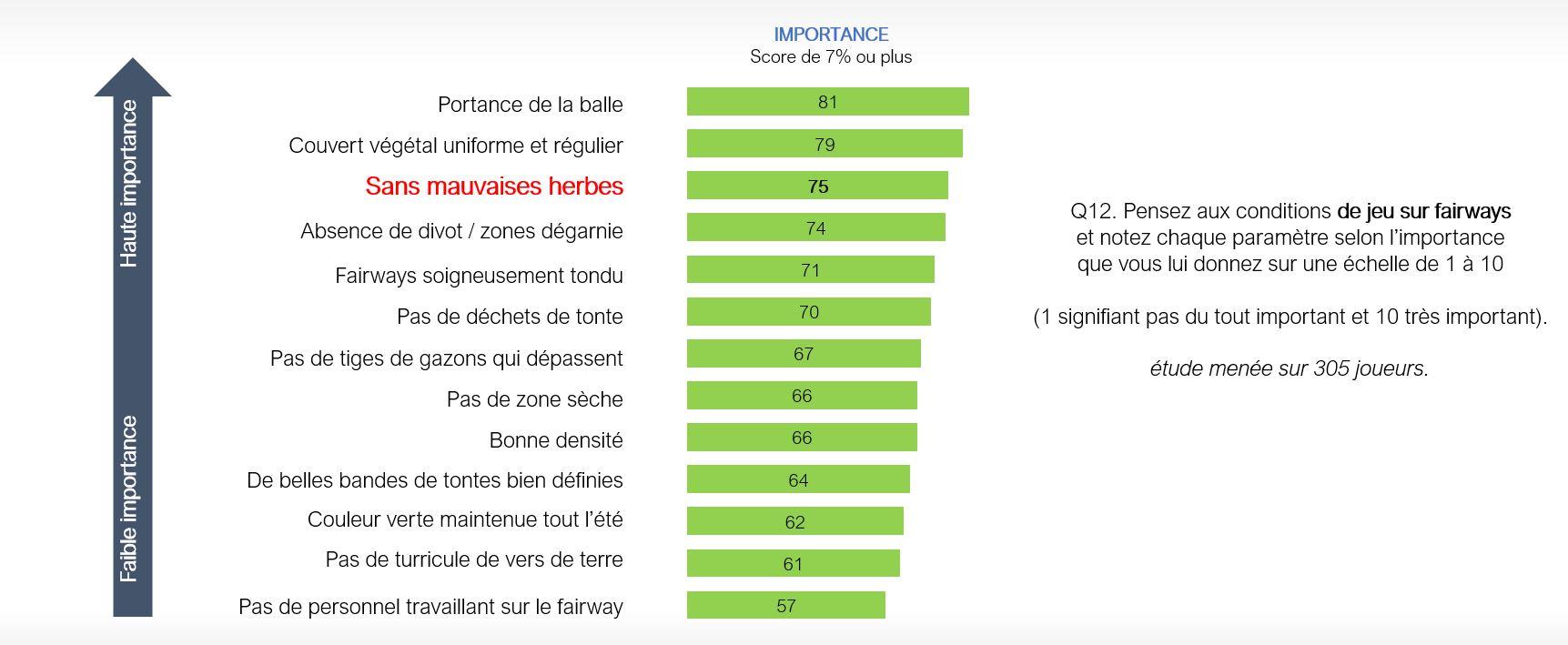 Voici les résultats d’une enquête récente concernant la qualité des fairways. Sur 13 critères au total, un fairway sans mauvais herbes se classe en 3ème positions dans les attentes des golfeurs.