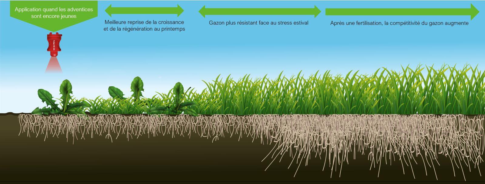 Supprimer les adventices tôt dans la saison permet d’améliorer les capacités de récupération du gazon en réduisant la compétition pour l’humidité, lumière et les nutriments.