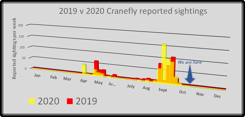 Cranefly. We’ve only had a few reported sightings this last couple of weeks which reflects exactly the same pattern as 2019.