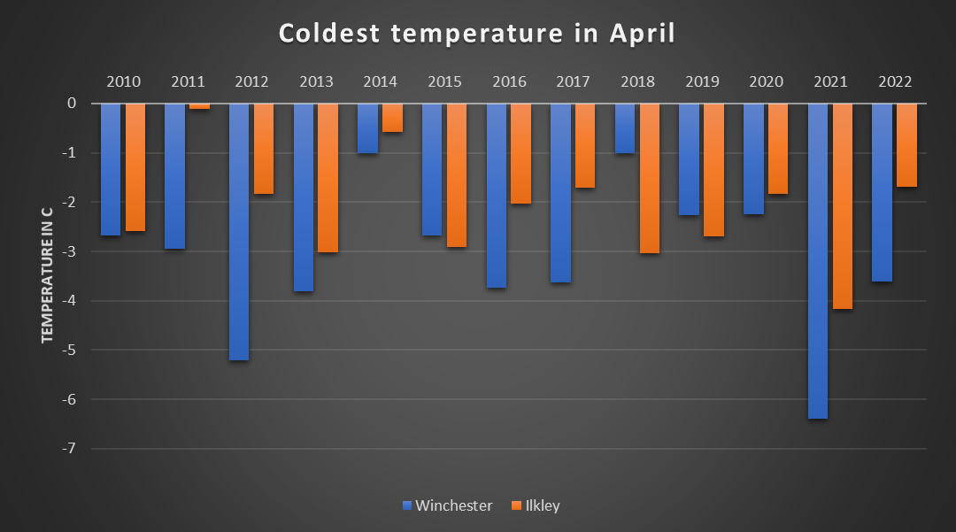 It’s been cold too, but nowhere near as cold as 2021. The above chart shows the coldest temperatures reached in two locations (South Coast and Yorkshire) in April over the last 13 years.