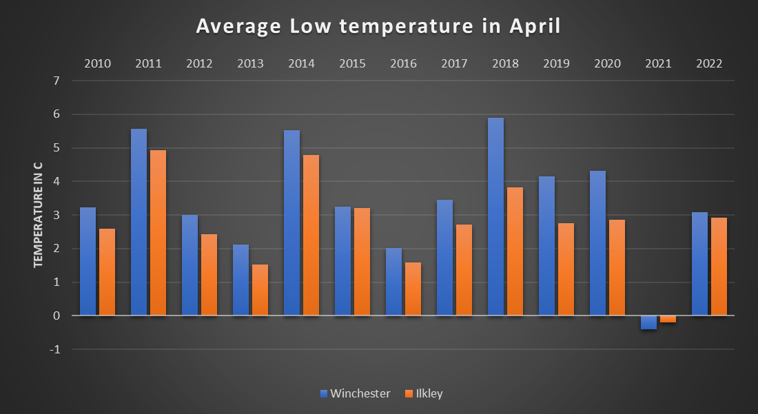 One last graph I promise, this one’s looking at the average low temperature for the month. I’ve taken the lowest temperature of each day and averaged it over the month to create one figure showing the extent of the growth stopping temperatures.