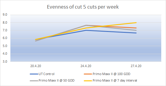 Again, it’s early in proceedings but the more cuts the better the quality. At this stage the evenness of cut is improved in every case where Primo is used, in fact currently the 1 cut a week plot with Primo is showing better evenness of cut than 5 cuts a week with no Primo (Surely that won’t last???).