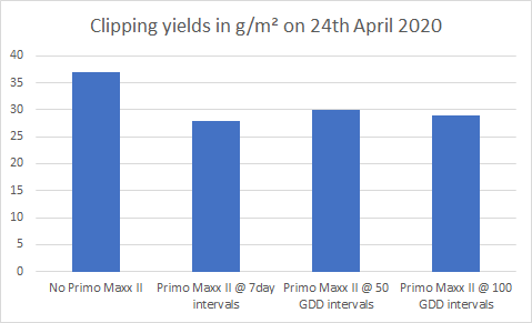 The Primo label permits 7 days between applications and a max rate of 0.4l/ha on greens. What we are doing by using the calendar method is layering the effect of Primo early on in the season whilst we have poor growing conditions but as the GDD figures draw out the layering effect will reduce. The program based on GDD should give a more consistent level of regulation but the calendar based program will allow us to apply the highest rate possible as stated on the label.
