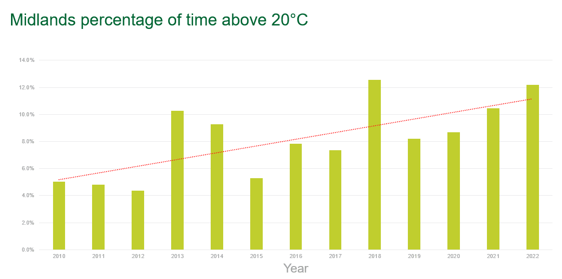 You can see in the graph below the clear trend for warmer summers (more time spent above 20°C). Not every year will be hotter than the previous, and we may get lucky and have a cool year in 2023, but its that trend that needs to get us thinking about the future.