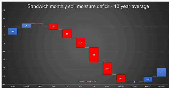 You may have already seen the recent GI article about water (follow the link for the full version). In that I talk about when the moisture equation changes. November – February see increasing water added to the soil on balance (the bars in blue). And for the deep South (Sandwich) March is the first month where we lose more water than we gain (the red bars).